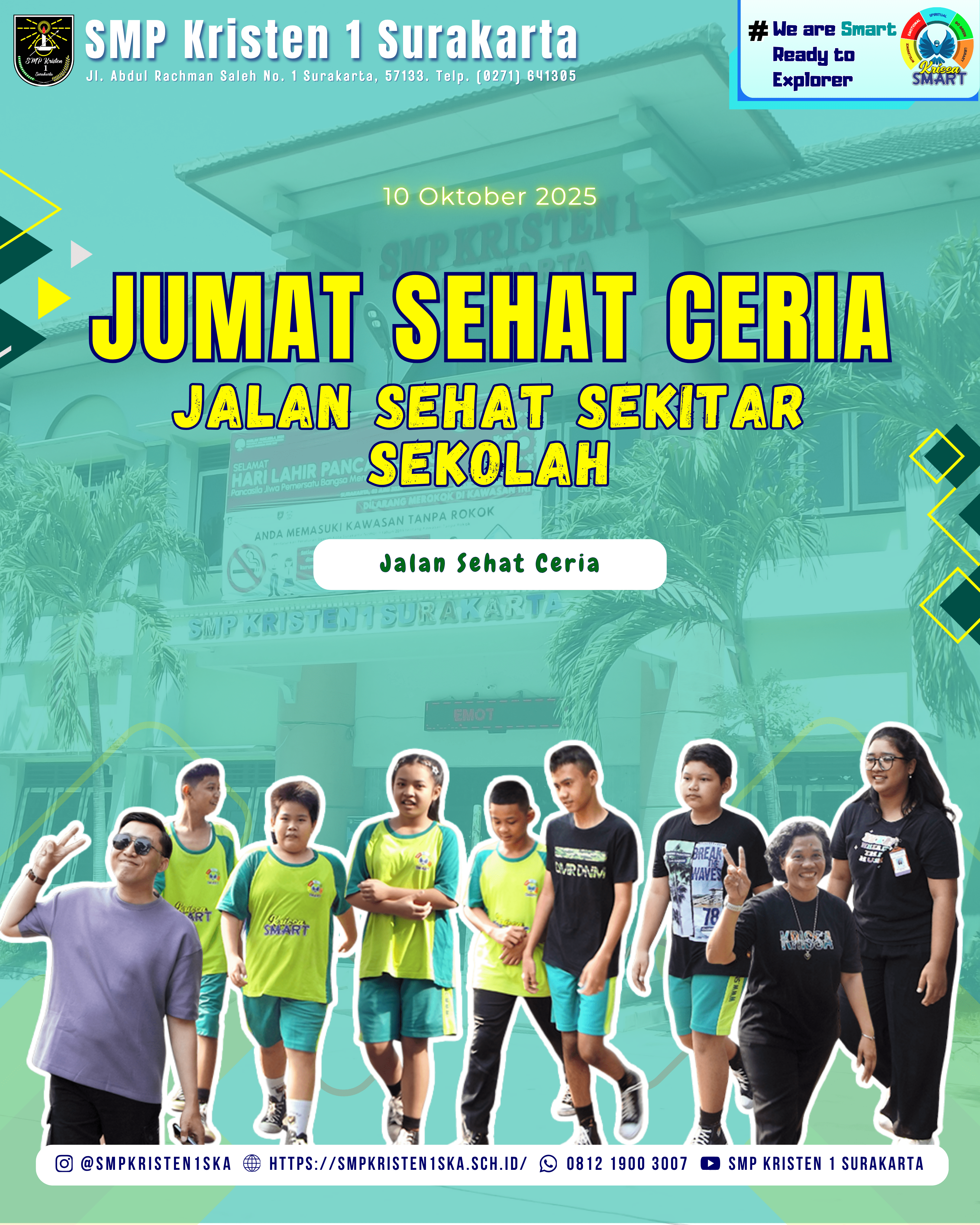 Kegiatan jumat sehat ceria adalah salah satu program SMP Krissa yang bertujuan untuk melatih anak bersosialisasi dengan lingkungan sekitar sekolah, dan meningkatkan suasana hati anak serta menenangkan pikiran saat pembelajaran di kelas dimulai.